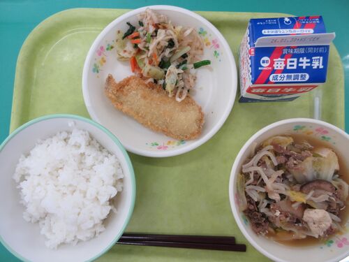◇今日の給食は、ごはん、すきやき風煮、おかかあえ、県産カレイフライでした。 ▲4-1 ▲4-2