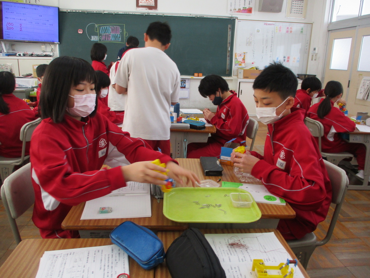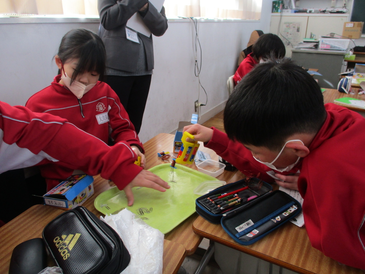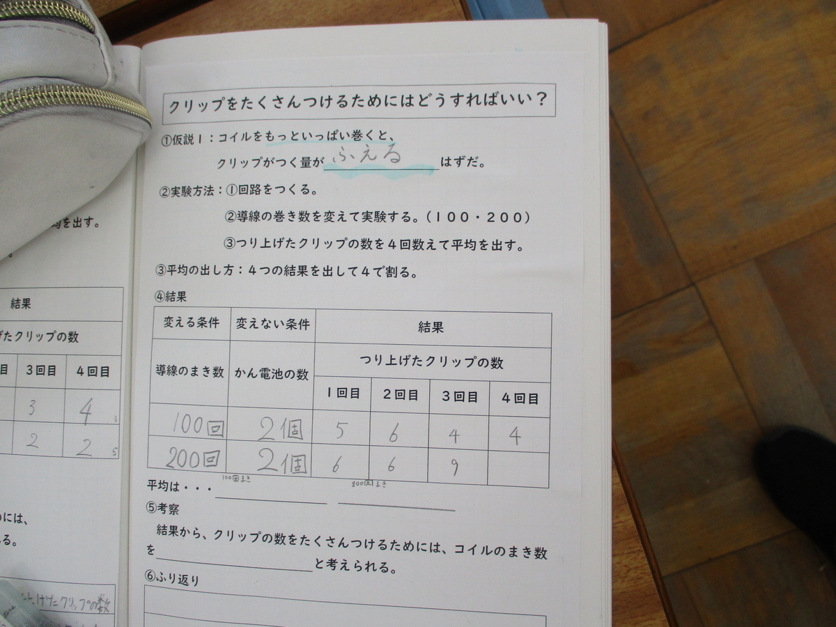 クリップをたくさんつけるためにはどうすればいい?という実験です。仮説を立てて実験をします。導線の巻き数を変えてやってみました。