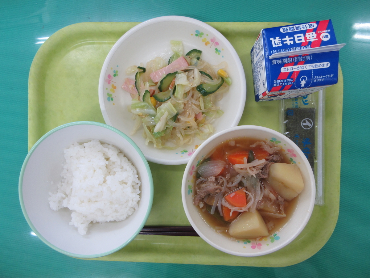 ◇今日の給食は、ごはん、肉じゃが、和風春雨サラダ、味つけのりです。
