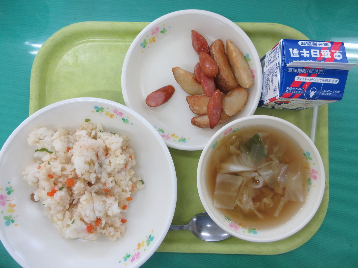 ◇今日の給食は、チャーハン、中華スープ、ウィンナーポテトです。