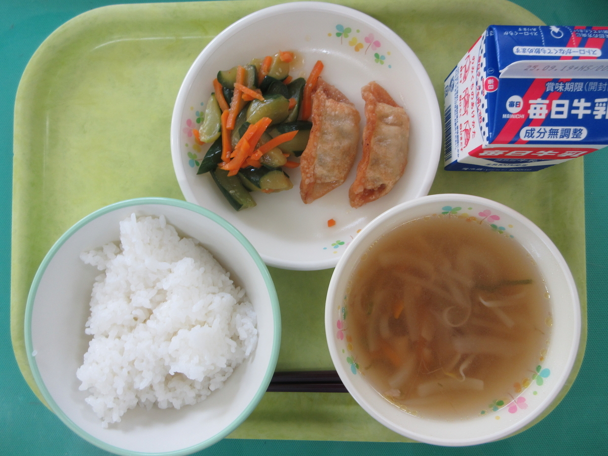 ◇11日の給食は、ごはん、五目スープ、ぎょうざの甘酢あん、きゅうりの中華づけでした。