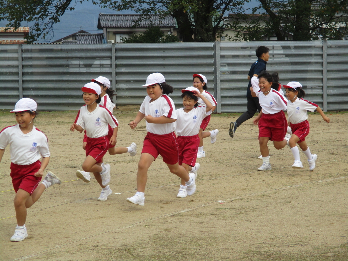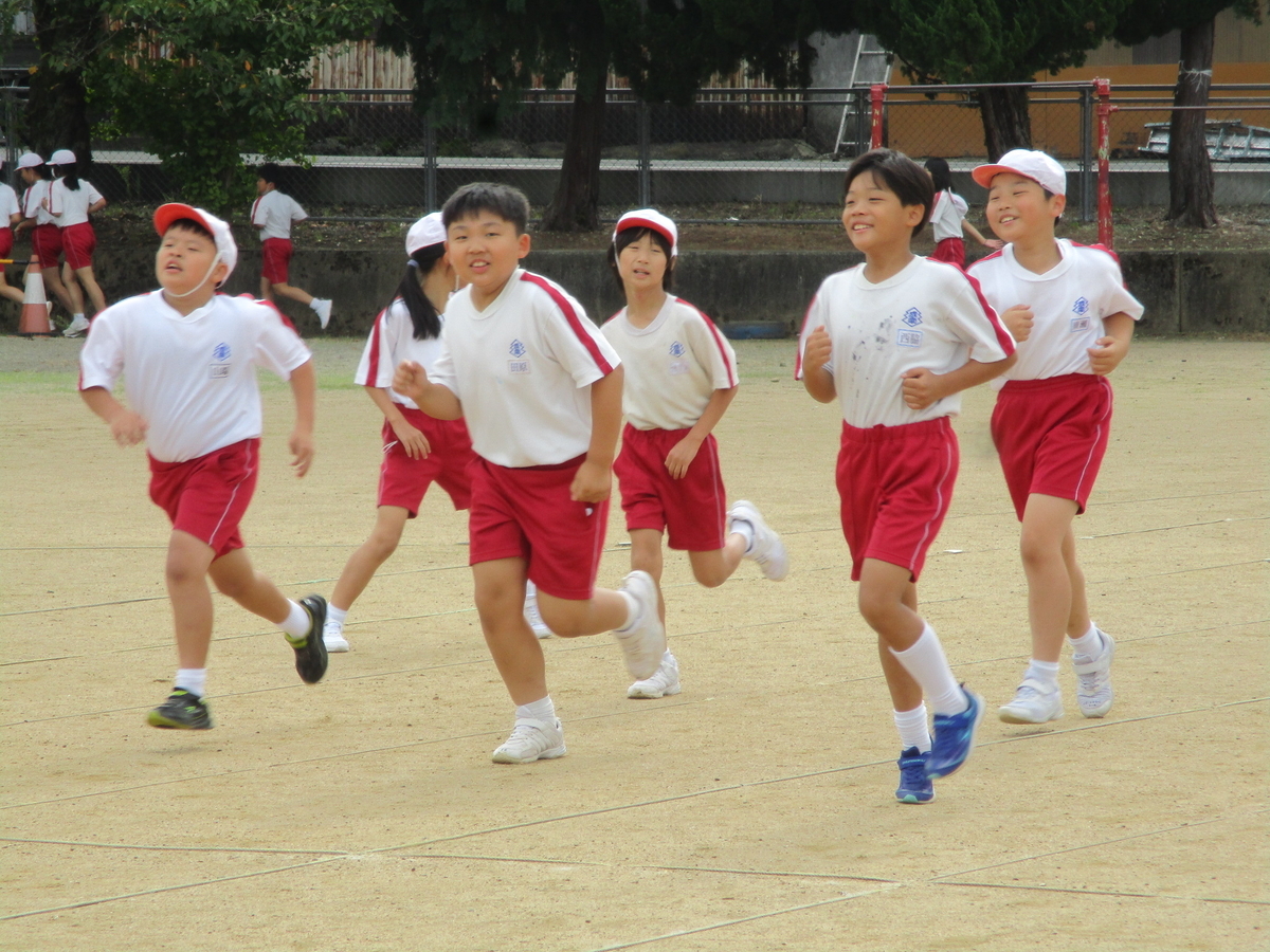 ▲2学期初めての「レッツラン」 音楽に合わせて3分間走りました。