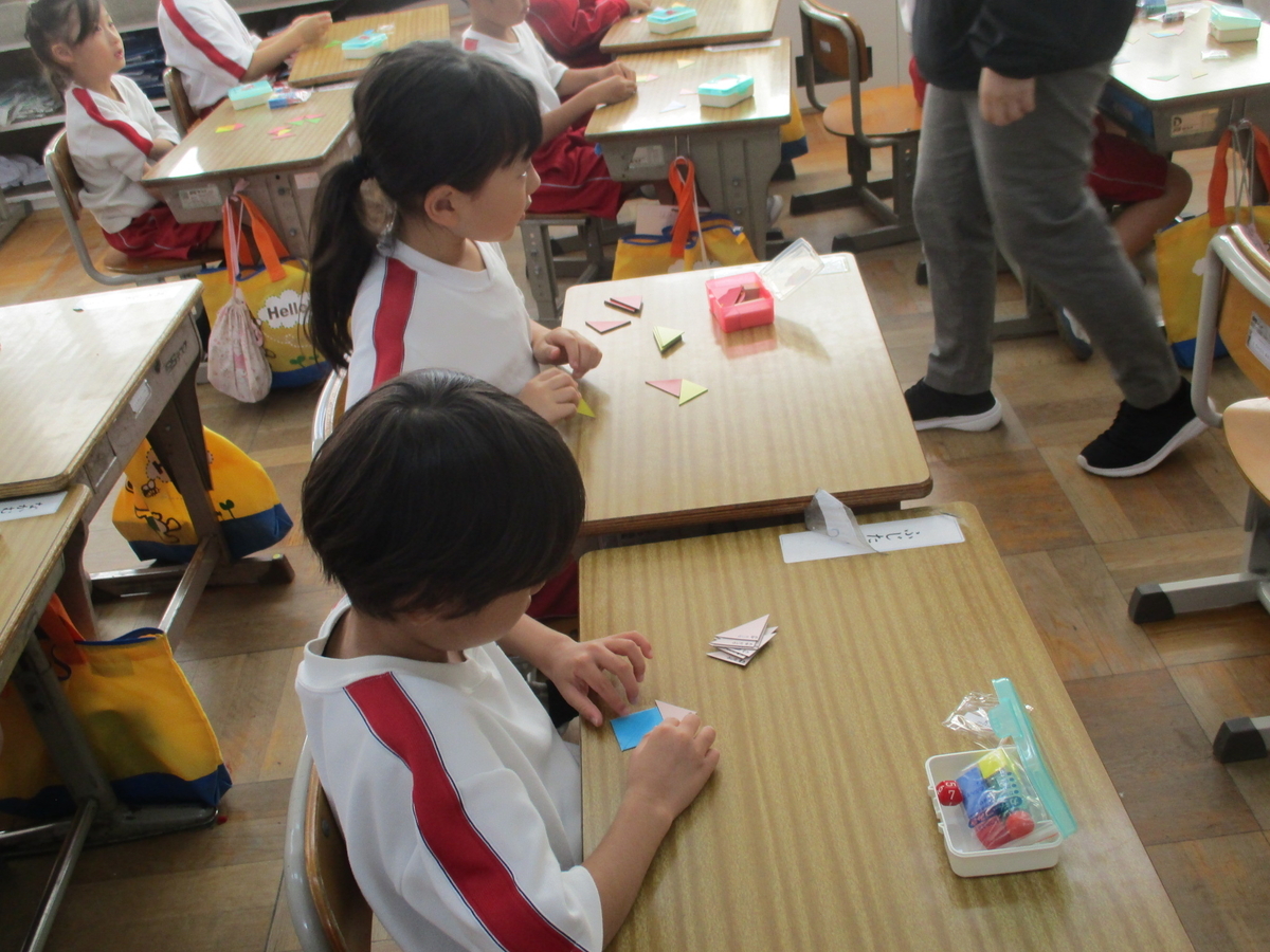 ▽1-1算数「かたちづくり」三角形の色板を使って、家や星などを作り、三角形を組み合わせてできる様々な形に親しみました。