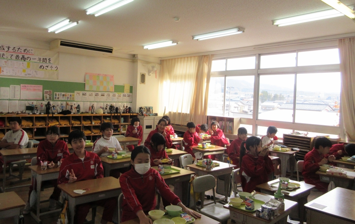 ◇今日の給食は、ごはん、かきたま汁、白身魚のいそべ揚げ、煮びたしでした。
