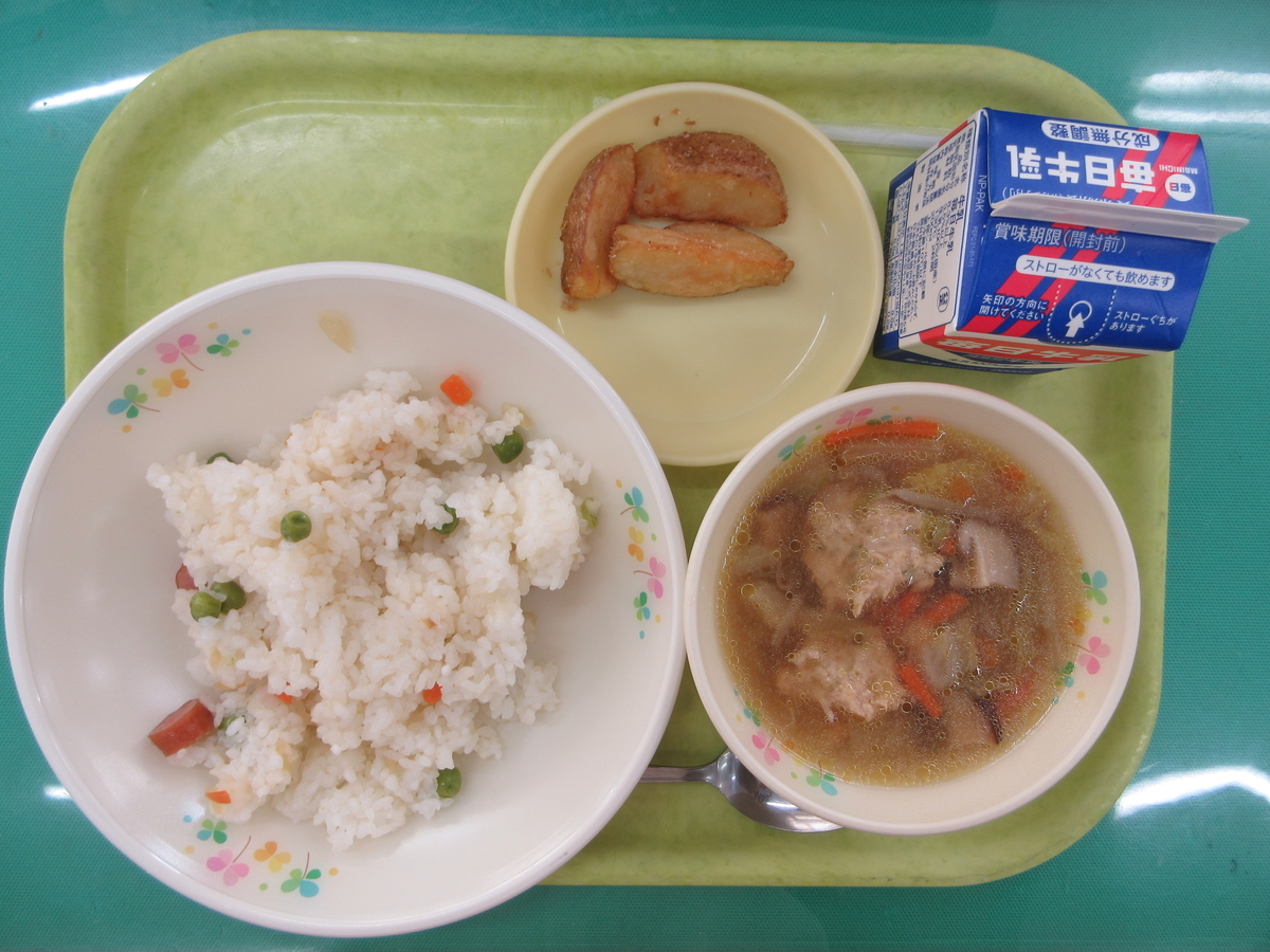 ◇16日の給食は、ピラフ、手作り肉団子のスープ、フライドポテトでした。